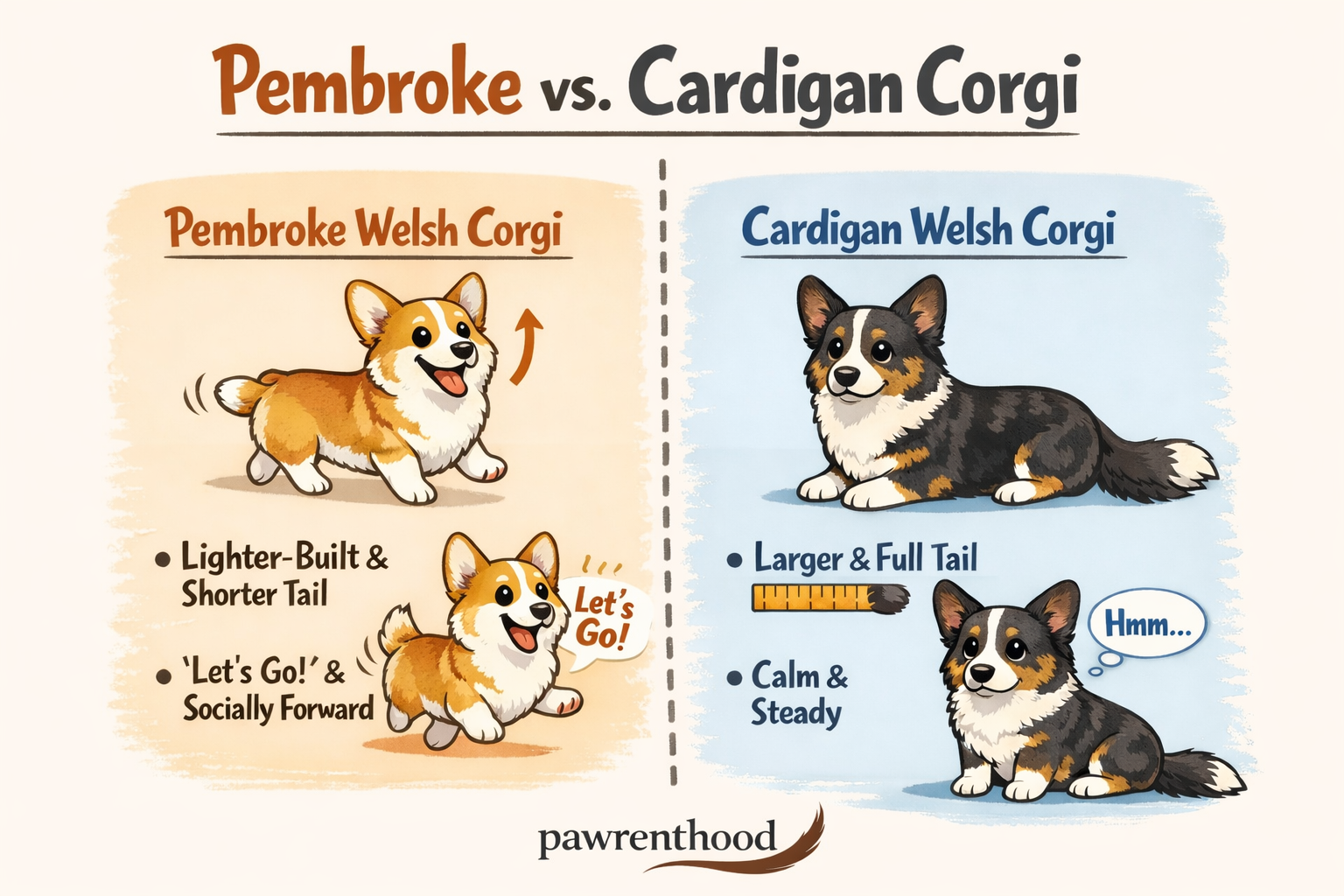 - Cardigan Welsh Corgi: generally a bit larger/longer-bodied with a fuller tail; often a touch more reserved and steady
